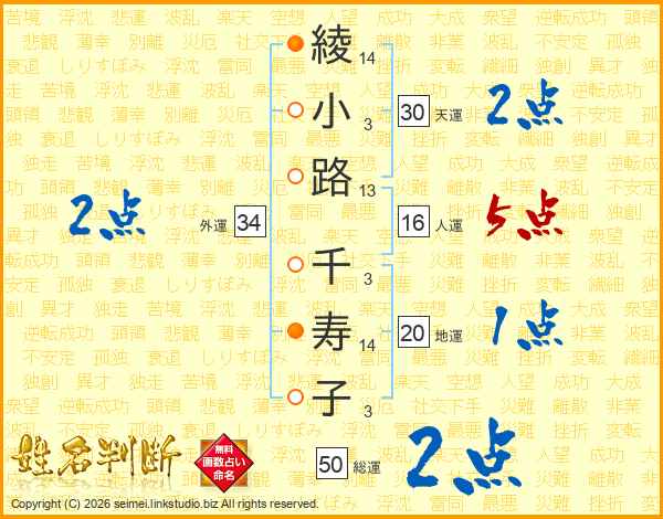 綾(14画)小(3画)路(13画) 千(3画)寿(14画)子(3画)