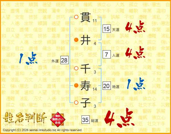 貫(11画)井(4画) 千(3画)寿(14画)子(3画)