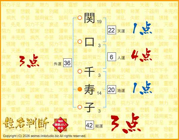関(19画)口(3画) 千(3画)寿(14画)子(3画)