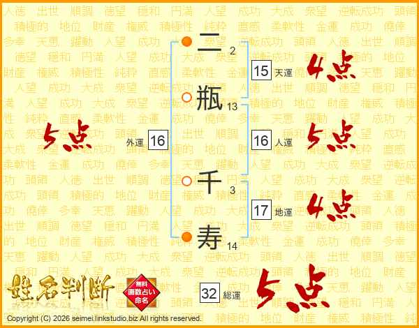 生活面を象徴する運勢です。外部から受ける影響力を表し、結婚運、家庭運や職場、環境への順応性を表します。総運から人運を引いた画数。姓や名が1文字の場合を除く。