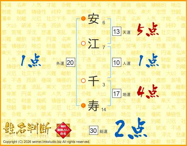 生活面を象徴する運勢です。外部から受ける影響力を表し、結婚運、家庭運や職場、環境への順応性を表します。総運から人運を引いた画数。姓や名が1文字の場合を除く。