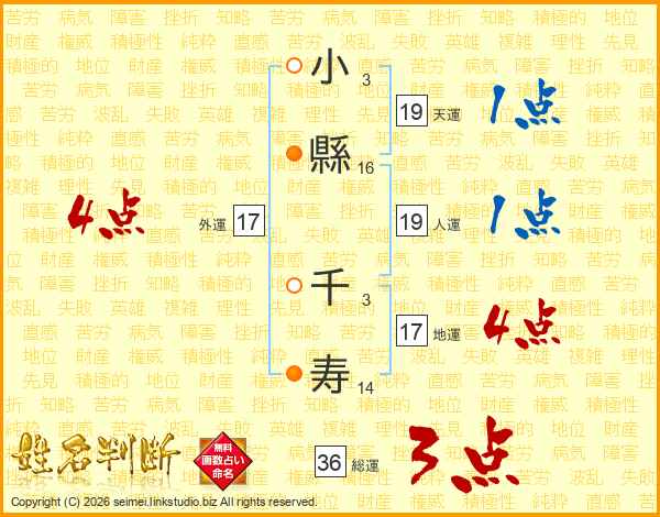 生活面を象徴する運勢です。外部から受ける影響力を表し、結婚運、家庭運や職場、環境への順応性を表します。総運から人運を引いた画数。姓や名が1文字の場合を除く。