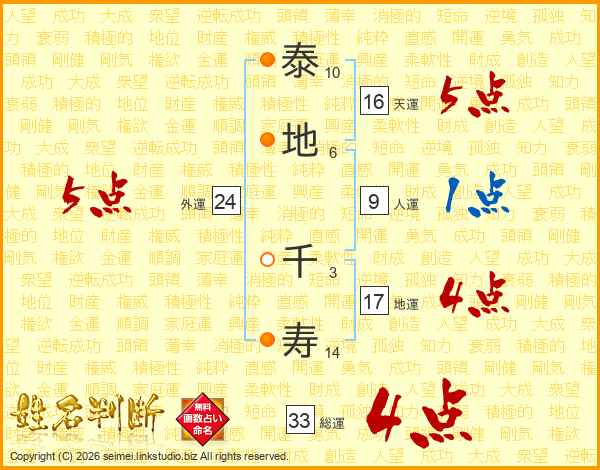 泰地千寿さんの総運は33画の4点!