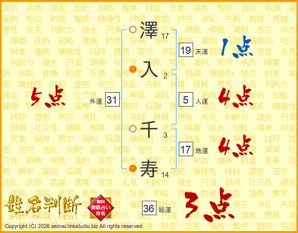 生活面を象徴する運勢です。外部から受ける影響力を表し、結婚運、家庭運や職場、環境への順応性を表します。総運から人運を引いた画数。姓や名が1文字の場合を除く。
