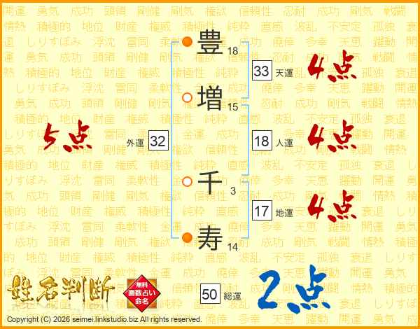 豊(18画)増(15画) 千(3画)寿(14画)