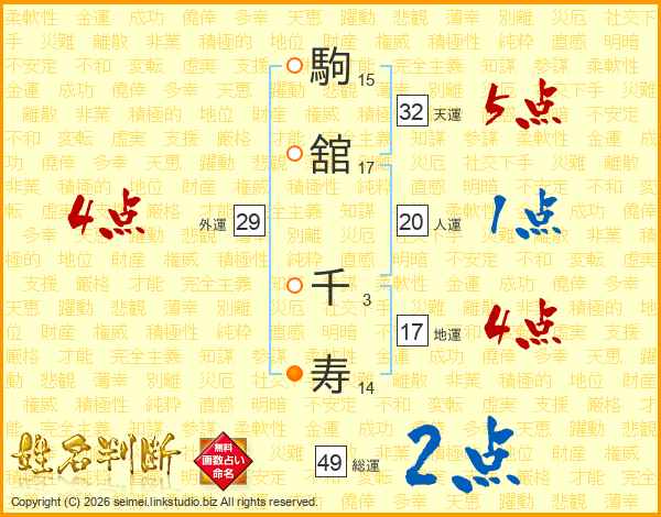 駒(15画)舘(17画) 千(3画)寿(14画)