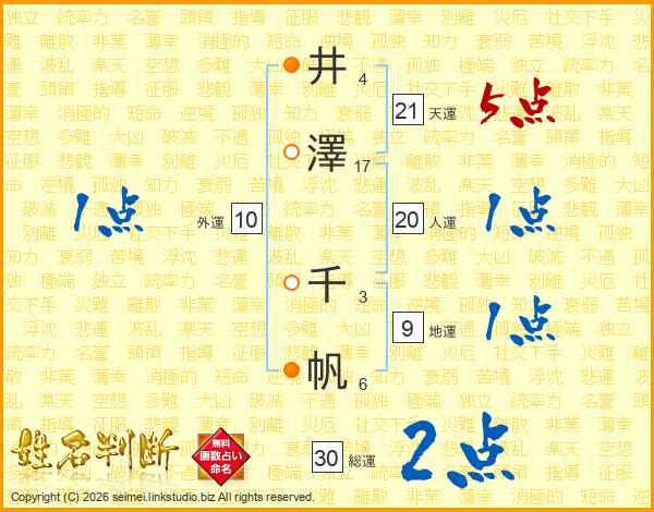 生活面を象徴する運勢です。外部から受ける影響力を表し、結婚運、家庭運や職場、環境への順応性を表します。総運から人運を引いた画数。姓や名が1文字の場合を除く。
