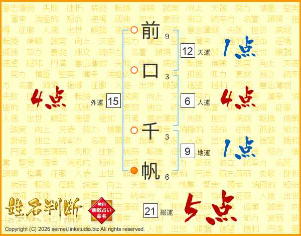 家系が持つ宿命的な運勢を表します。祖先から受け継いだ苗字ですので自分の力が及びません。家柄を象徴します。苗字の合計画数。