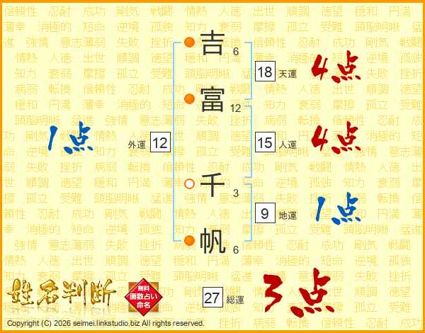 生活面を象徴する運勢です。外部から受ける影響力を表し、結婚運、家庭運や職場、環境への順応性を表します。総運から人運を引いた画数。姓や名が1文字の場合を除く。