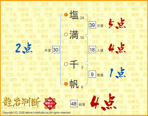 生活面を象徴する運勢です。外部から受ける影響力を表し、結婚運、家庭運や職場、環境への順応性を表します。総運から人運を引いた画数。姓や名が1文字の場合を除く。