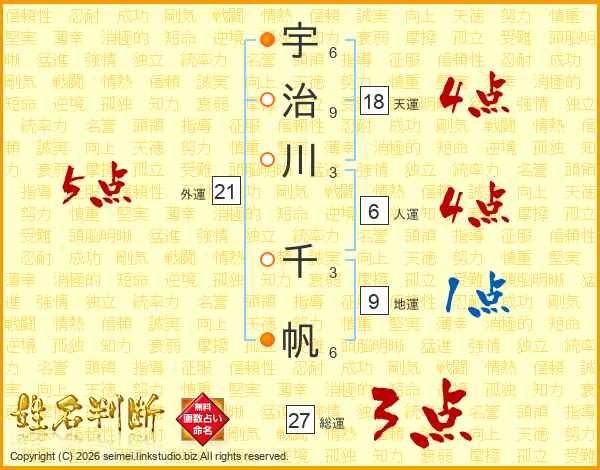 宇(6画)治(9画)川(3画) 千(3画)帆(6画)
