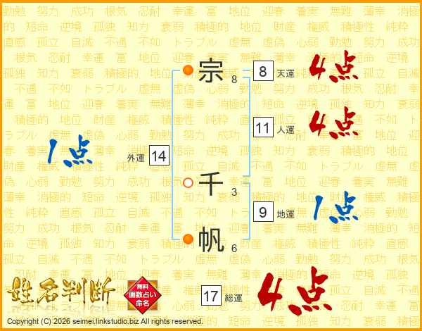 生活面を象徴する運勢です。外部から受ける影響力を表し、結婚運、家庭運や職場、環境への順応性を表します。総運から人運を引いた画数。姓や名が1文字の場合を除く。