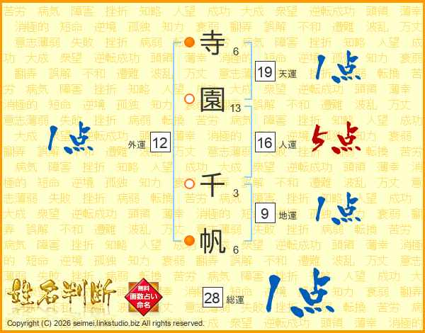 寺(6画)園(13画) 千(3画)帆(6画)