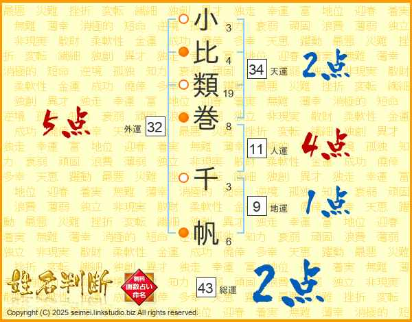 小(3画)比(4画)類(19画)巻(8画) 千(3画)帆(6画)