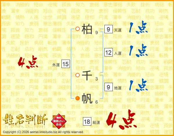 生活面を象徴する運勢です。外部から受ける影響力を表し、結婚運、家庭運や職場、環境への順応性を表します。総運から人運を引いた画数。姓や名が1文字の場合を除く。