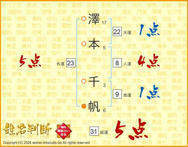 生活面を象徴する運勢です。外部から受ける影響力を表し、結婚運、家庭運や職場、環境への順応性を表します。総運から人運を引いた画数。姓や名が1文字の場合を除く。