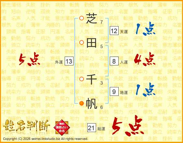 生活面を象徴する運勢です。外部から受ける影響力を表し、結婚運、家庭運や職場、環境への順応性を表します。総運から人運を引いた画数。姓や名が1文字の場合を除く。