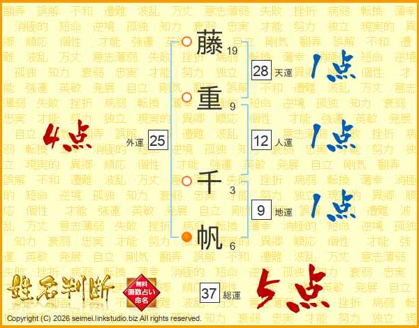 家系が持つ宿命的な運勢を表します。祖先から受け継いだ苗字ですので自分の力が及びません。家柄を象徴します。苗字の合計画数。