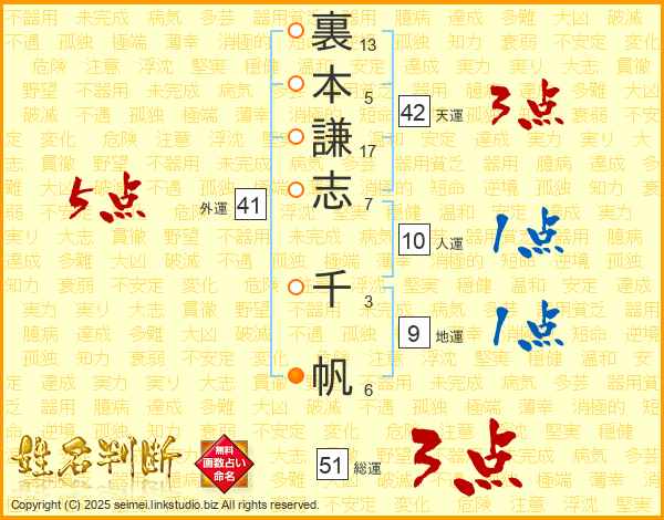裏(13画)本(5画)謙(17画)志(7画) 千(3画)帆(6画)
