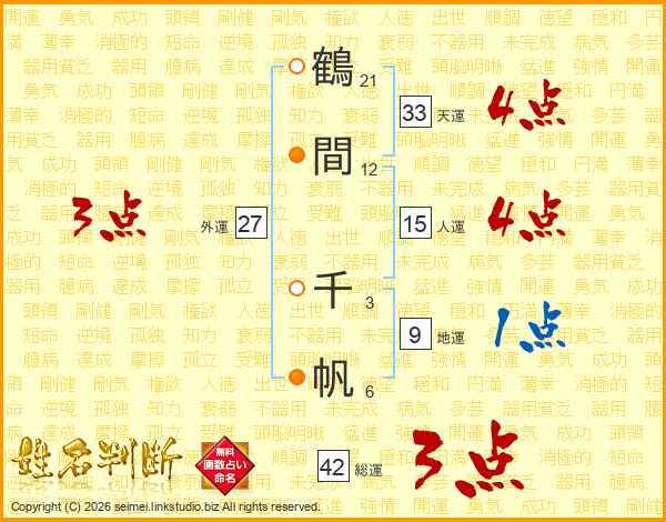 鶴(21画)間(12画) 千(3画)帆(6画)