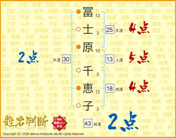 冨(12画)士(3画)原(10画) 千(3画)恵(12画)子(3画)