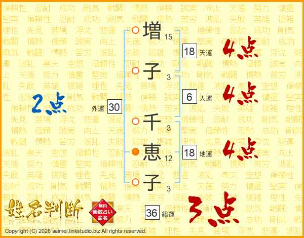 増(15画)子(3画) 千(3画)恵(12画)子(3画)