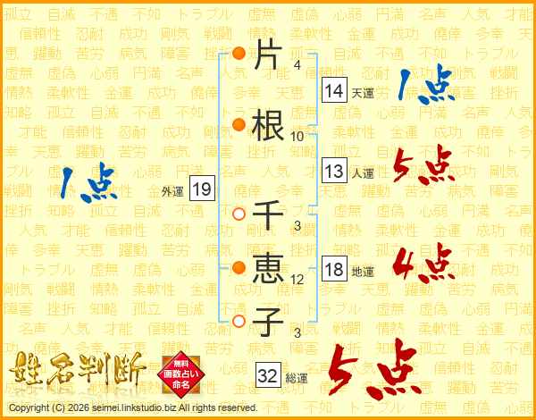 片(4画)根(10画) 千(3画)恵(12画)子(3画)
