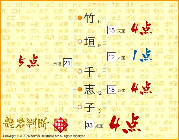 竹(6画)垣(9画) 千(3画)恵(12画)子(3画)