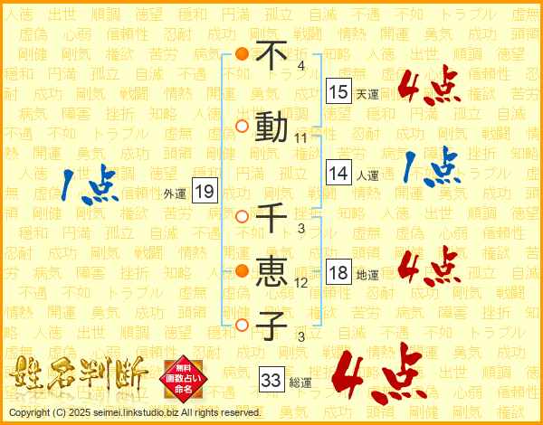 不(4画)動(11画) 千(3画)恵(12画)子(3画)