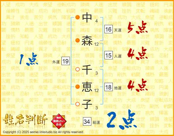 中(4画)森(12画) 千(3画)恵(12画)子(3画)