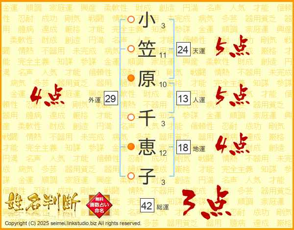 小(3画)笠(11画)原(10画) 千(3画)恵(12画)子(3画)