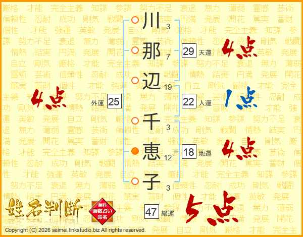 川(3画)那(7画)辺(19画) 千(3画)恵(12画)子(3画)