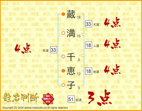 蔵(18画)満(15画) 千(3画)恵(12画)子(3画)