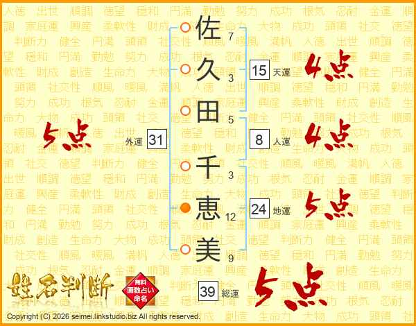 佐(7画)久(3画)田(5画) 千(3画)恵(12画)美(9画)