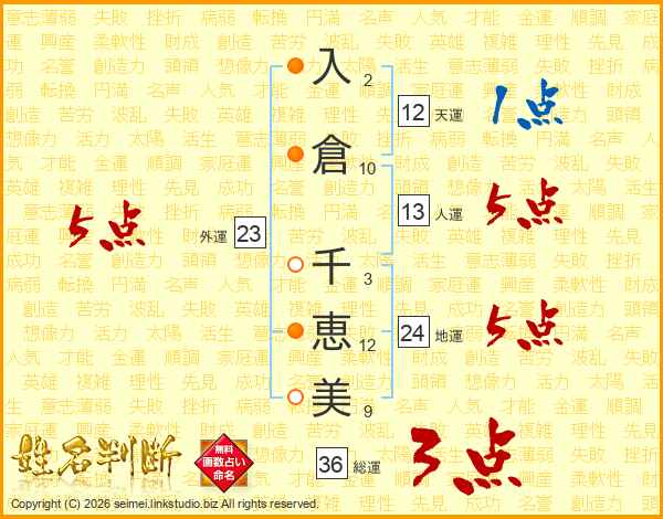 入(2画)倉(10画) 千(3画)恵(12画)美(9画)