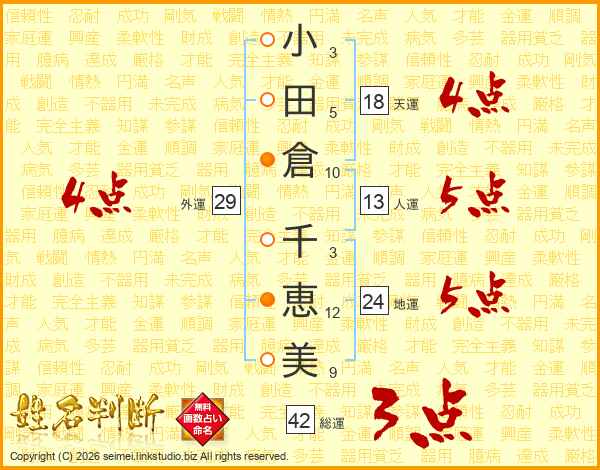 小(3画)田(5画)倉(10画) 千(3画)恵(12画)美(9画)