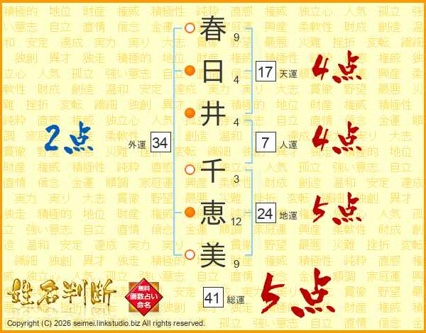 春(9画)日(4画)井(4画) 千(3画)恵(12画)美(9画)