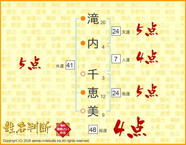 滝(20画)内(4画) 千(3画)恵(12画)美(9画)