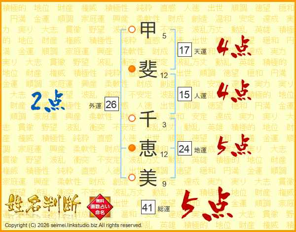 甲(5画)斐(12画) 千(3画)恵(12画)美(9画)