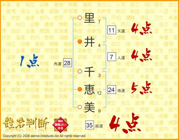 里(7画)井(4画) 千(3画)恵(12画)美(9画)