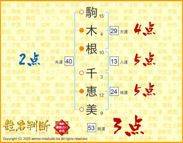 駒(15画)木(4画)根(10画) 千(3画)恵(12画)美(9画)