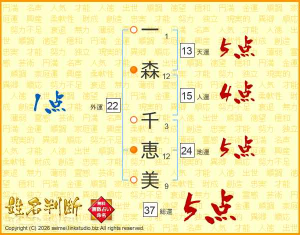 一(1画)森(12画) 千(3画)恵(12画)美(9画)