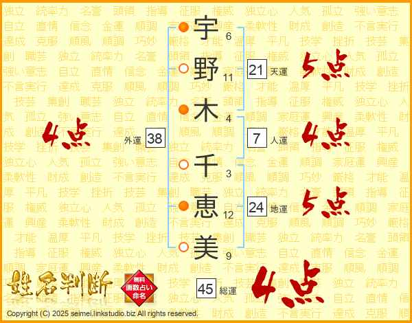 宇(6画)野(11画)木(4画) 千(3画)恵(12画)美(9画)