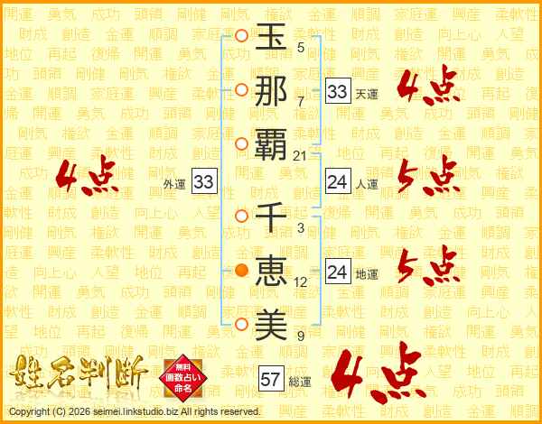 玉(5画)那(7画)覇(21画) 千(3画)恵(12画)美(9画)