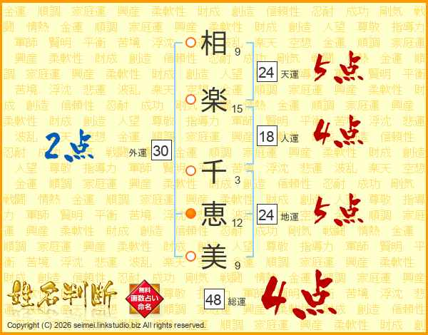 相(9画)楽(15画) 千(3画)恵(12画)美(9画)