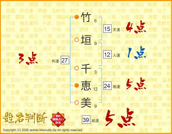 竹(6画)垣(9画) 千(3画)恵(12画)美(9画)