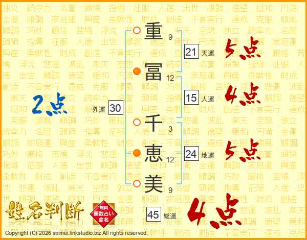 重(9画)冨(12画) 千(3画)恵(12画)美(9画)