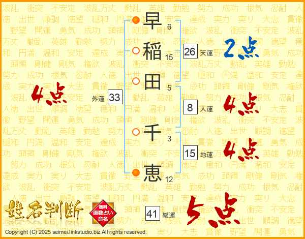 早(6画)稲(15画)田(5画) 千(3画)恵(12画)
