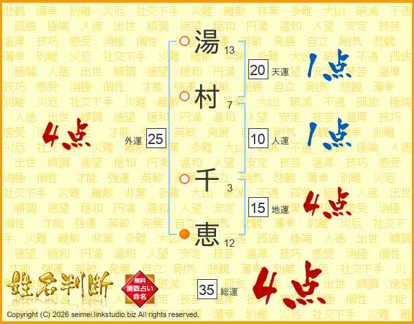 生活面を象徴する運勢です。外部から受ける影響力を表し、結婚運、家庭運や職場、環境への順応性を表します。総運から人運を引いた画数。姓や名が1文字の場合を除く。