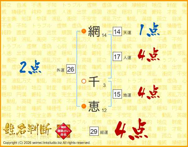 網(14画) 千(3画)恵(12画)